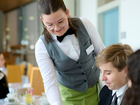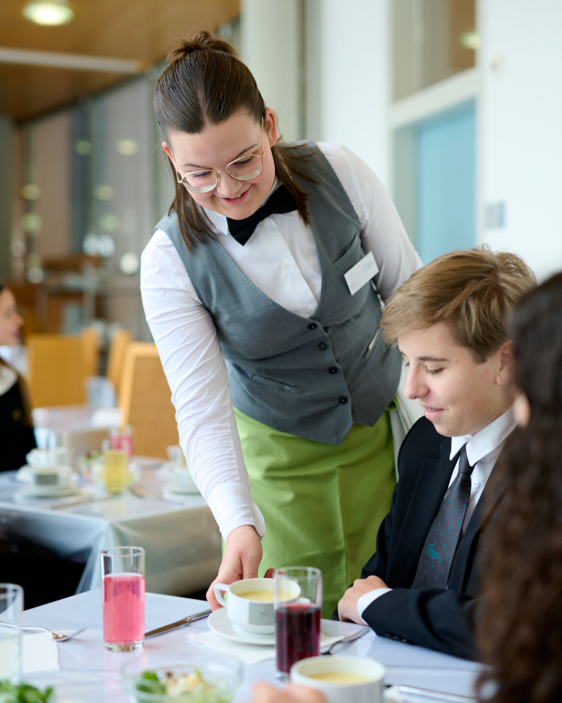 Das gemeinsame Essen (Mittagsverpflegung), für Schüler:innen, Studierende und das gesamte KTS Team, wird im Lehrhotel, unserem Internat, dem 4****Atrium serviert. Im Rahmen vom Betriebspraktikum sind die jeweiligen Klassen für die Verpflegung (Küche, Service) zuständig.