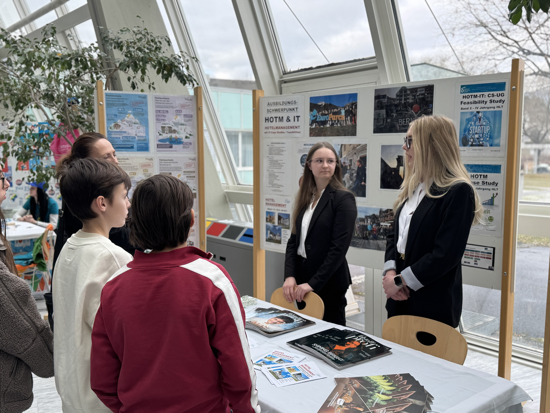 Im Reisebüro geben Schüler:innen bei Schulvorstellungen Einblick in die drei Schultypen der 5-jährigen Höheren Lehranstalt “Hotelmanagement mit IT”, “Internationales Tourismusmanagement” und “Tourismus und Pferdewirtschaft” sowie zum Kolleg für Tourismus „5-Sterne Management ALL INCLUSIVE“ und an den einzelnen Infoständen konntest du dich persönlich genauer beraten lassen.