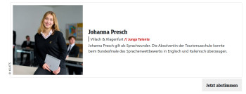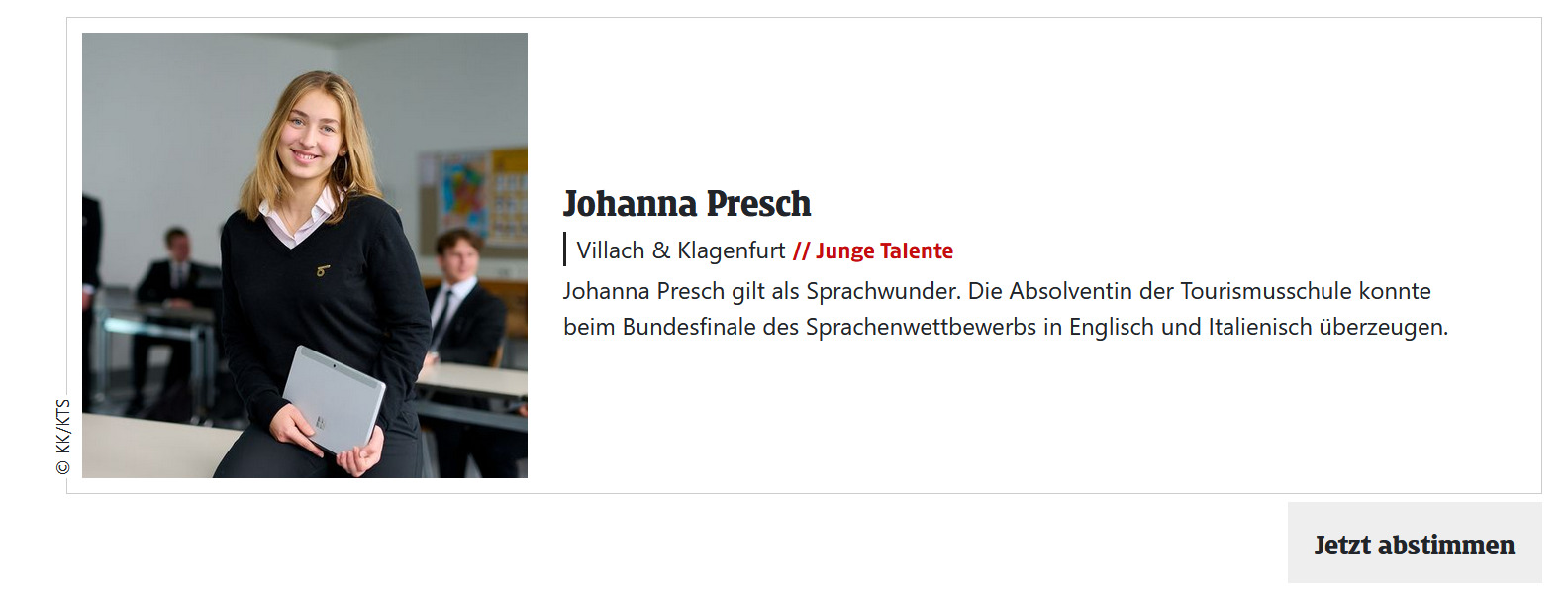 Unserere Absolventin Johanna Presch, ein Sprachentalent, hat letztes Jahr das Bundesfinale des Sprachencontests im Bewerb Mehrsprachigkeit Englisch/Italienisch in Wien gewonnen und ist für die Wahl „Köpfe des Jahres Kärnten“ aus der Region „Villach & Klagenfurt“ als „Junges Talent“ nominiert.