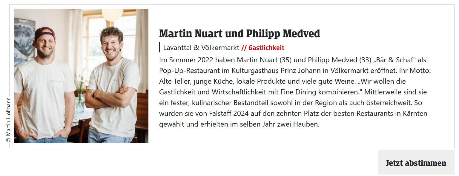 Und unser kongeniales Absolventenduo Martin Nuart und Philipp Medwed von der Schaf & Bär Wirtschaft durfte sich über einen grünen Michelin Stern freuen und ist bei der Wahl „Köpfe des Jahres Kärnten“ aus der Region „Lavanttal & Völkermarkt“ und der Rubrik „Gastlichkeit“ nominiert.