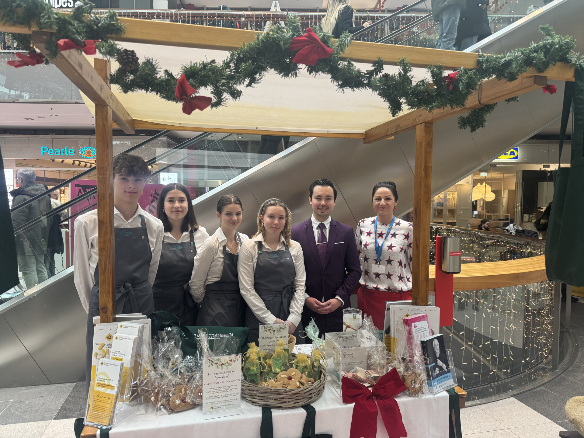 Am 2. vorweihnachtlichen Einkaufssamstag betreuten Schüler:innen der 2AT den Stand der Österreichischen Krebshilfe Kärnten und sammelten fleißig Spenden für im Unterricht zuvor gebackene Lebkuchenherzen.
