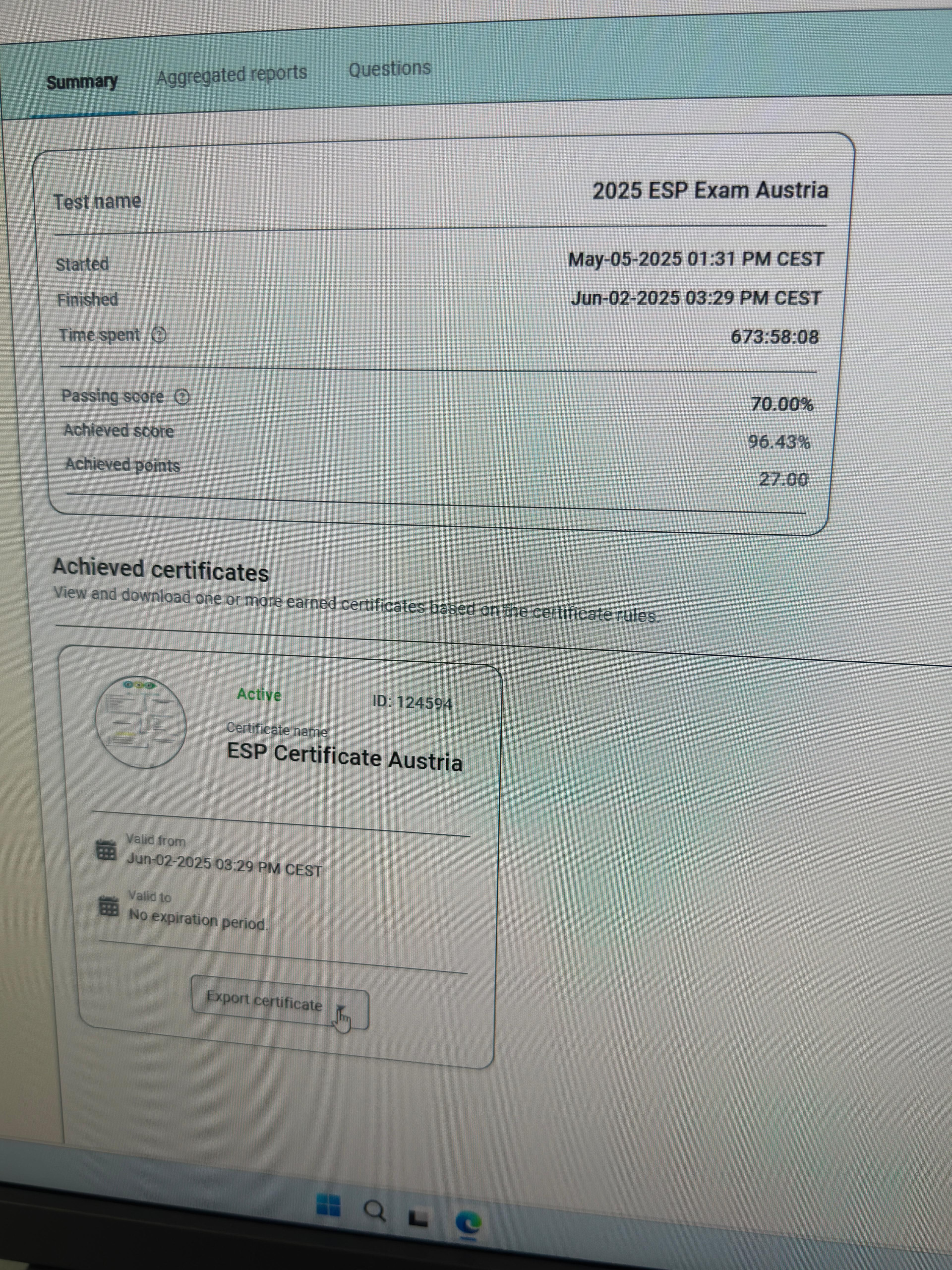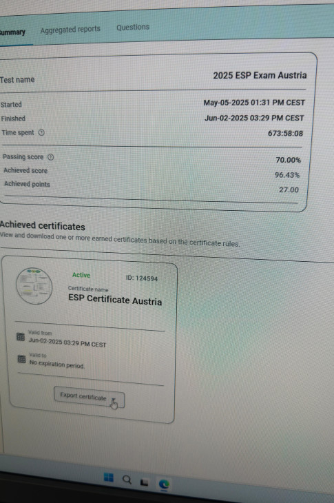 Im ersten Schritt (März/April) erfolgt auf der Online-Plattform die Registrierung und eine Selbstevaluierung – einer Reflexion der eigenen unternehmerischen Fähigkeiten und Wachstumspotentiale. Im zweiten Schritt (ab Mai) erfolgt die offizielle OnlinePrüfung (12 Fragen, max. 45 Minuten, mind. 70 %); nach erfolgreicher Prüfung erhalten die Teilnehmer:innen den ESP in digitaler Form.