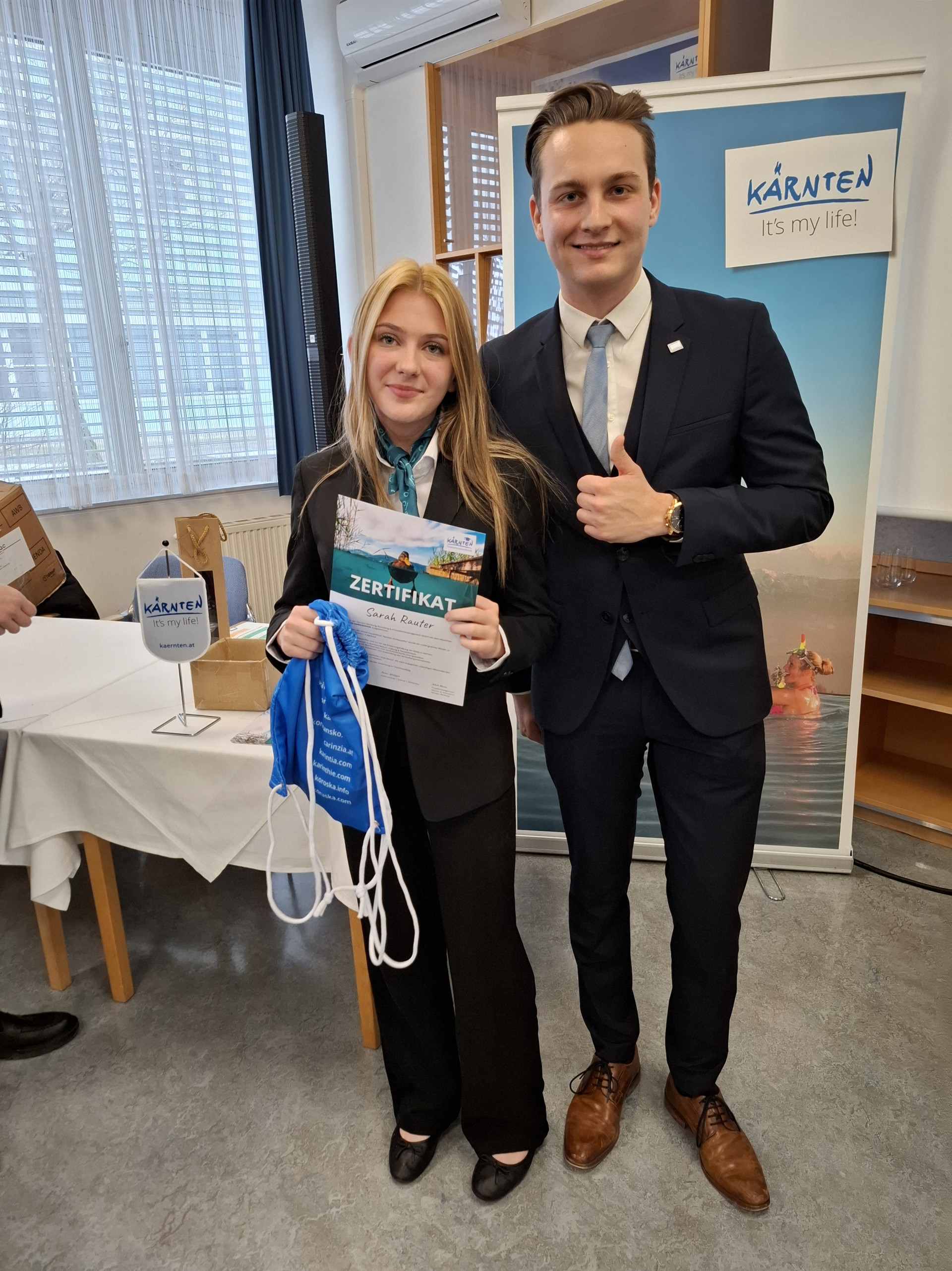 Am Montag fand die Verleihung der Kärnten Ambassador Zertifikate statt, die Schüler:innen der ersten Klassen sind nun stolze Kärnten Botschafter:innen. Das wurde in einer coolen Zeremonie so richtig gefeiert. Christina aus der 1AT begeisterte bei ihrem Fachgespräch besonders und darf sich über  ein Praktikum bei der Kärnten Werbung freuen.