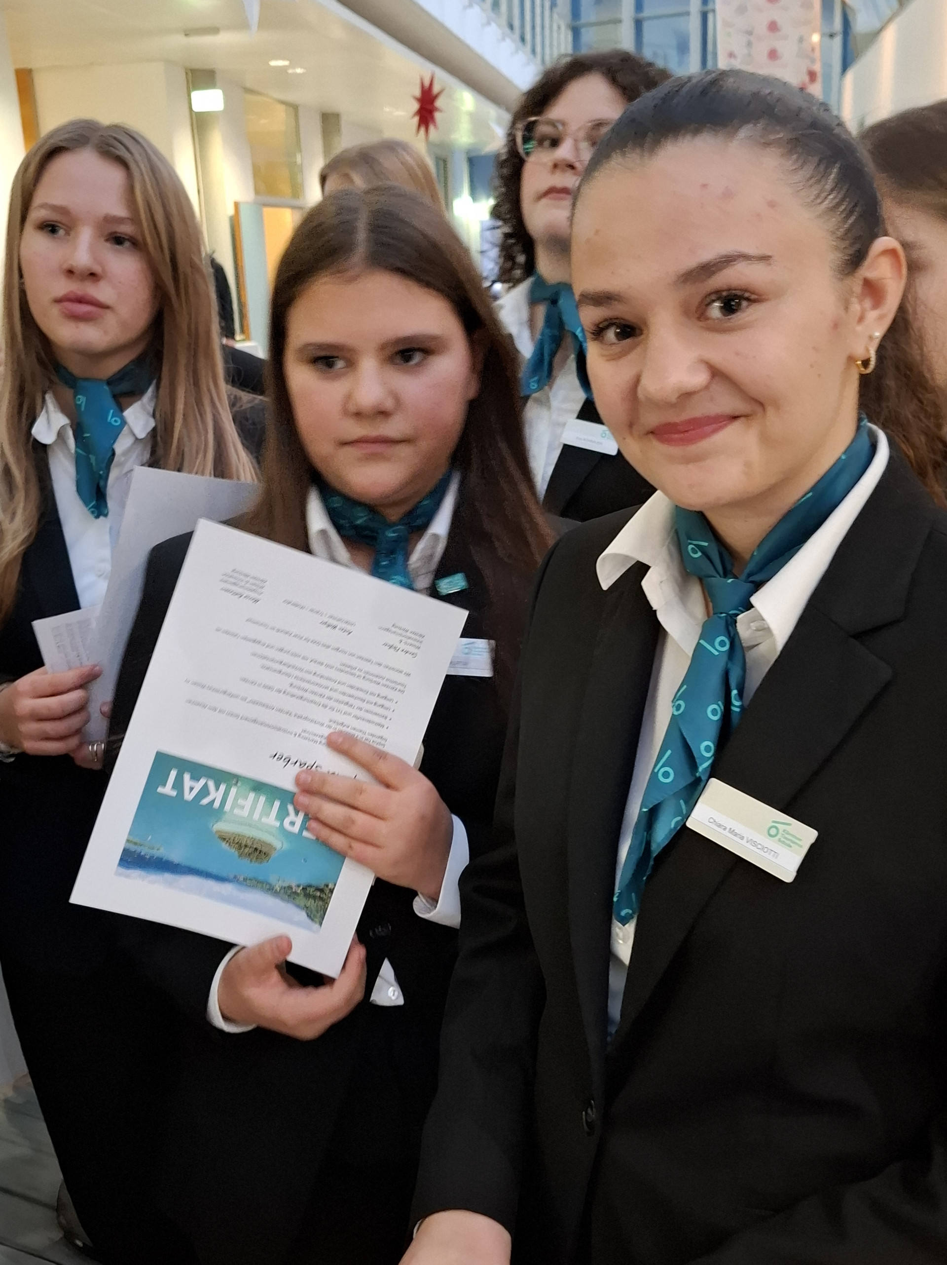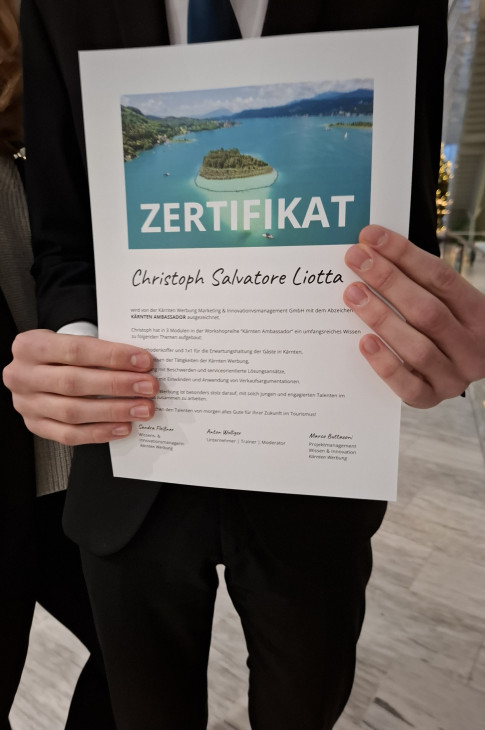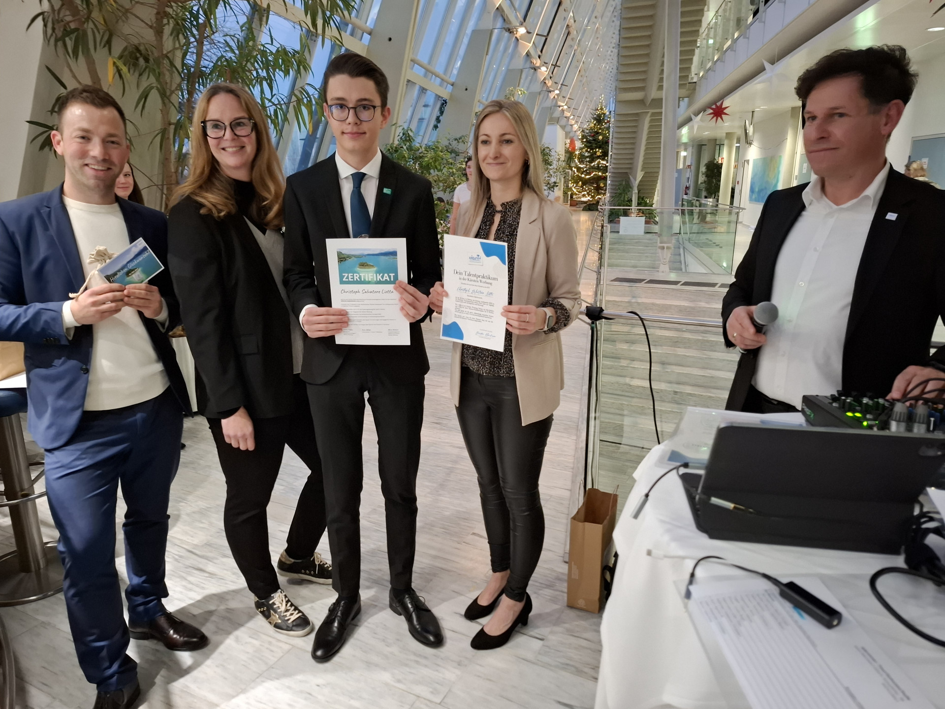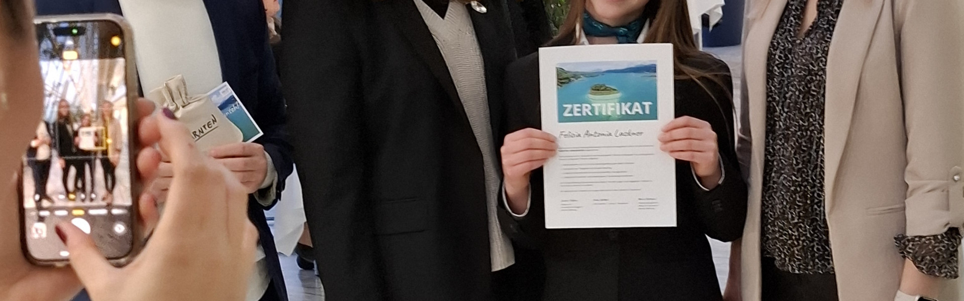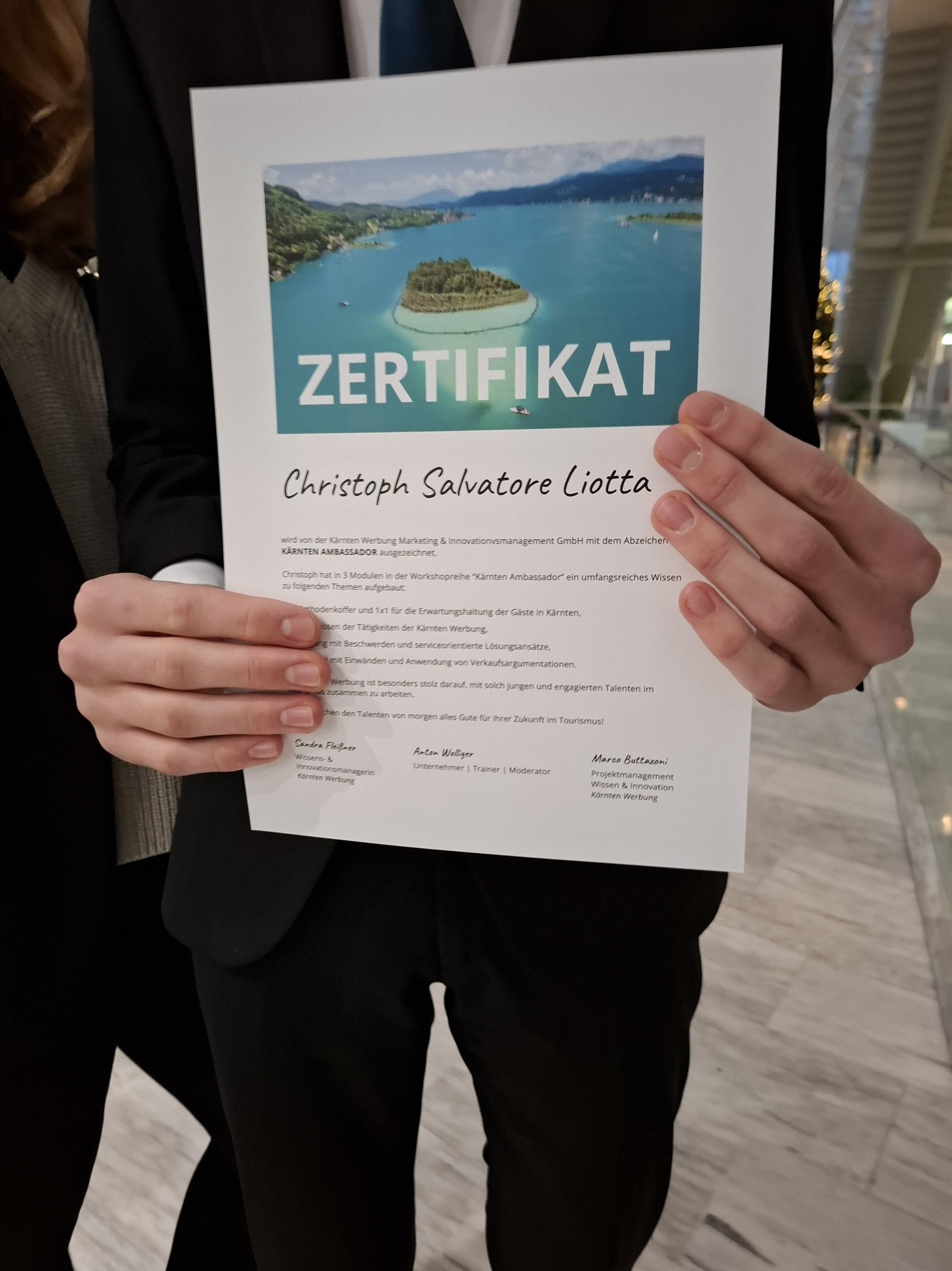 Am 12. Dezember fand die erste Verleihung der Kärnten Ambassador Zertifikate statt, die Schüler:innen der ersten Klassen sind nun stolze Kärnten Botschafter:innen. Das wurde in einer coolen Zeremonie so richtig gefeiert. Christoph und Elisabeth, beide 1 AT, dürfen sich darüber hinaus für ihr ganz besonders überzeugendes Fachgespräch über ein Talente-Praktikum bei der Kärnten Werbung freuen. Danke an Marco Buttazoni, Toni Wollinger, Nina Vielgut und Sandra Fleissner für die perfekte Planung und Durchführung des neuen Zertifikates, welches ab heuer fix in allen ersten Klassen angeboten wird.