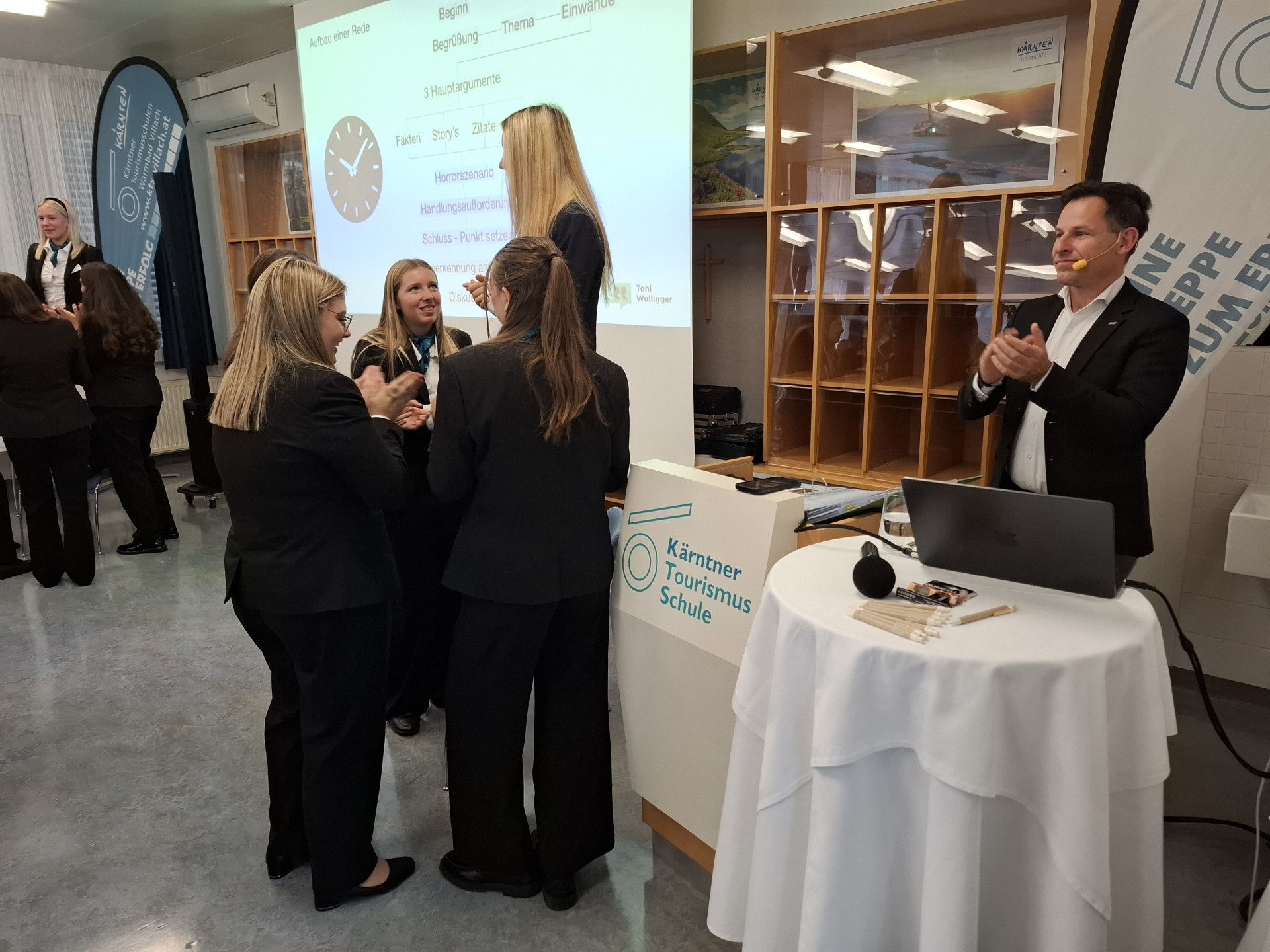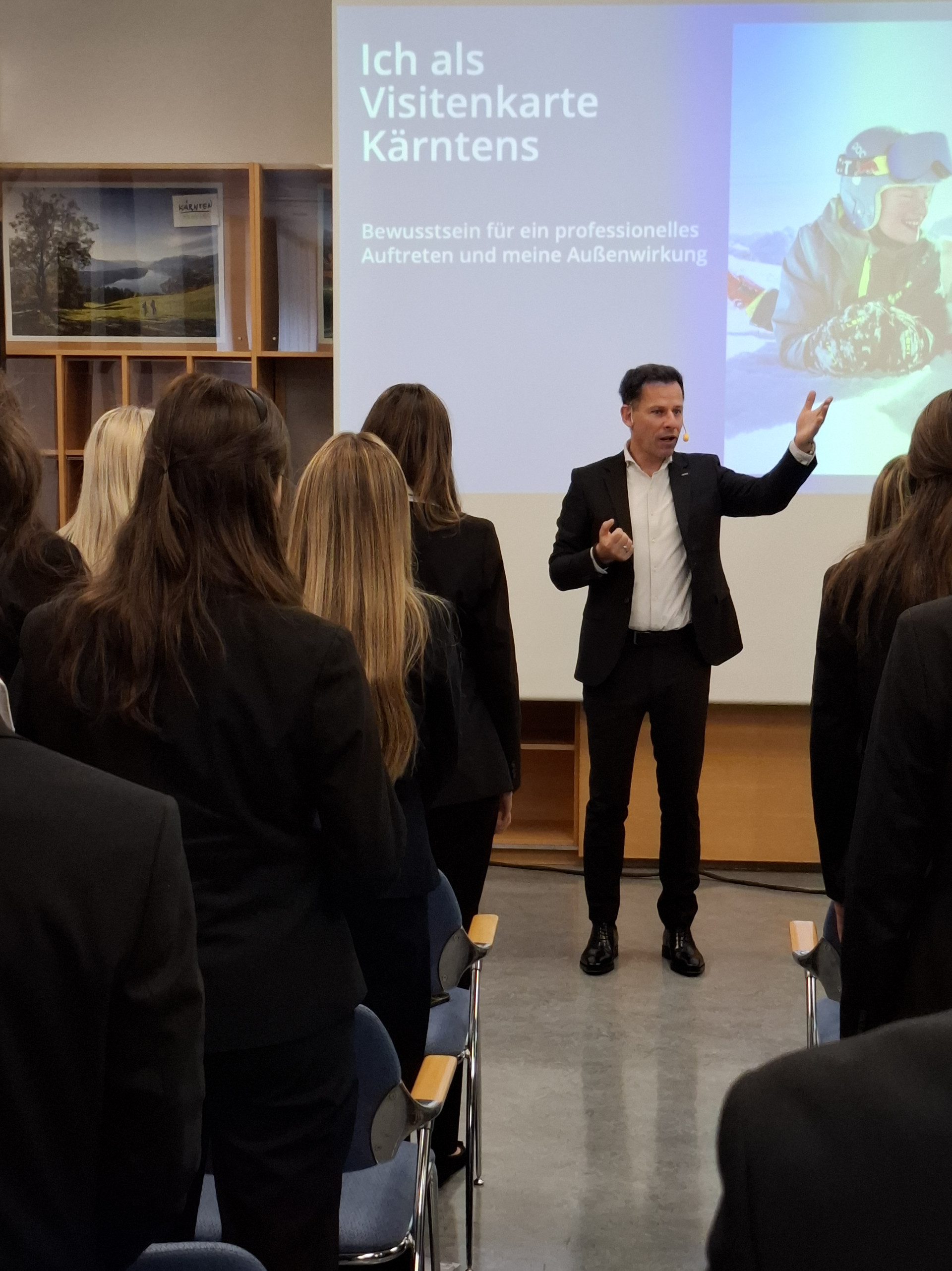 Auch heuer wird für unsere ersten Klassen das Zertifikat „Kärnten Ambassador“ angeboten. Am 19. November fand der KickOff-Workshop an der KTS statt . Unterstützt vom Team der Tourismusakademie/Kärnten Werbung erarbeiteten die jungen Tourismusschüler:innen die Kernwerte der Marke Kärnten. Moderator und Coach Toni Wolliger begeisterte mit einem Impuls zur Persönlichkeitsentwicklung mit ganz vielen Beispielen und Geschichten. Er trainierte in Kleingruppen die Gesprächsführung mit dem Gast, das Verkaufen und den Umgang mit Beschwerden. Unterstützt wurde er von unserem Absolventen Jakob Moser, der aktuelle Projekte und Angebote der Kärnten Werbung vorstellte.