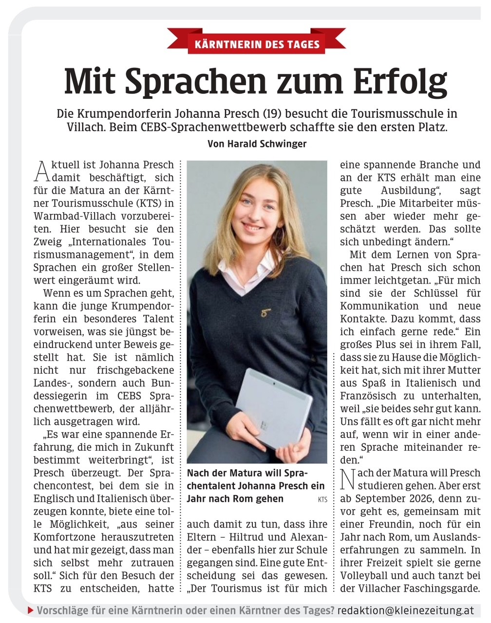 Wir gratulieren unserer Maturantin Johanna herzlich! Die Kärntnerin des Tages (Kleine Zeitung; Fr., 02.05.2025) hat den Bundessprachenwettbewerb gewonnen. Sie ist ein richtige Sprachentalent und daher war der sprachenorientierte Zweig „Internationales Tourismusmanagement“ an der KTS für Sie genau der richtige Ausbildungsweg.