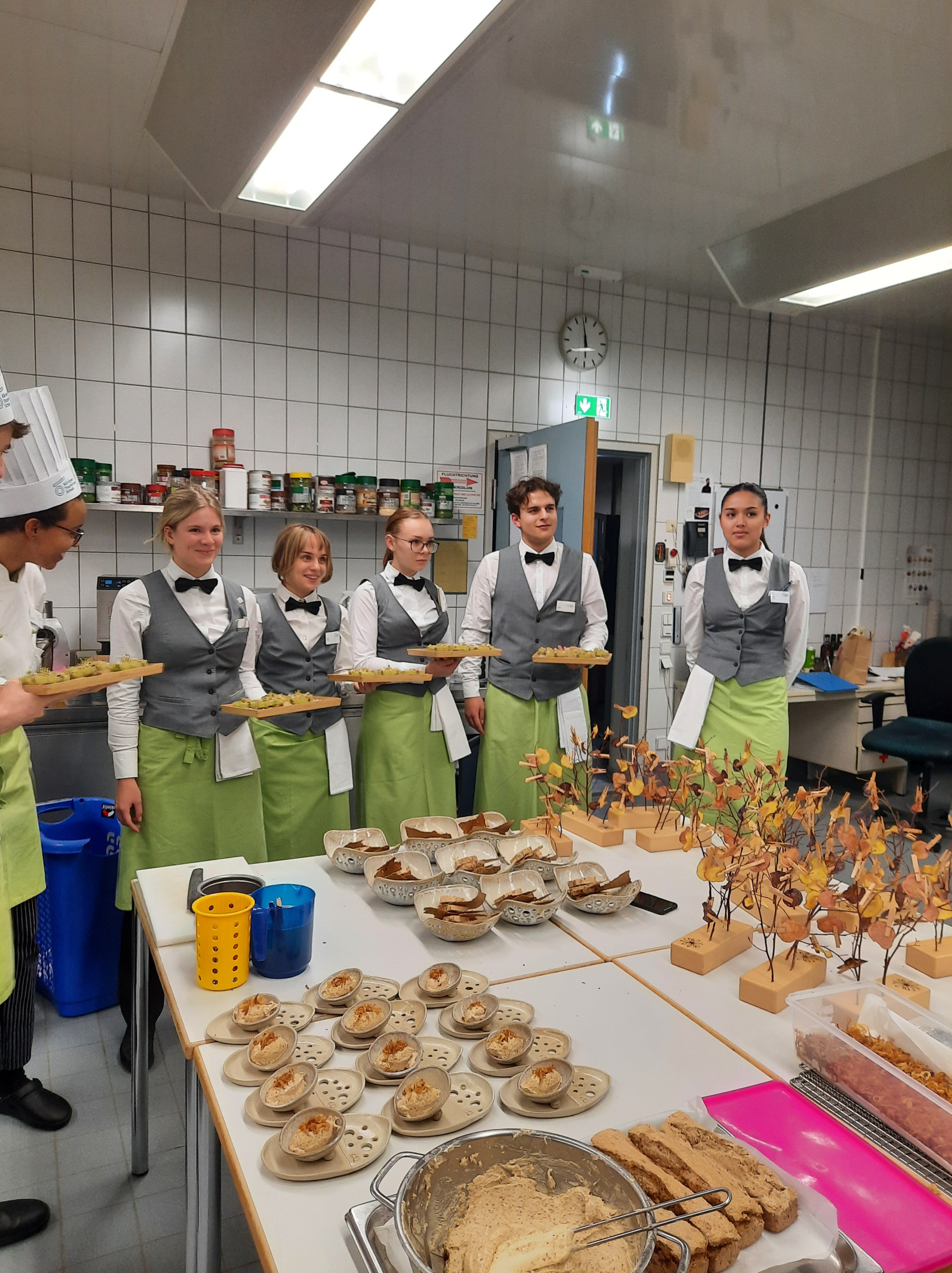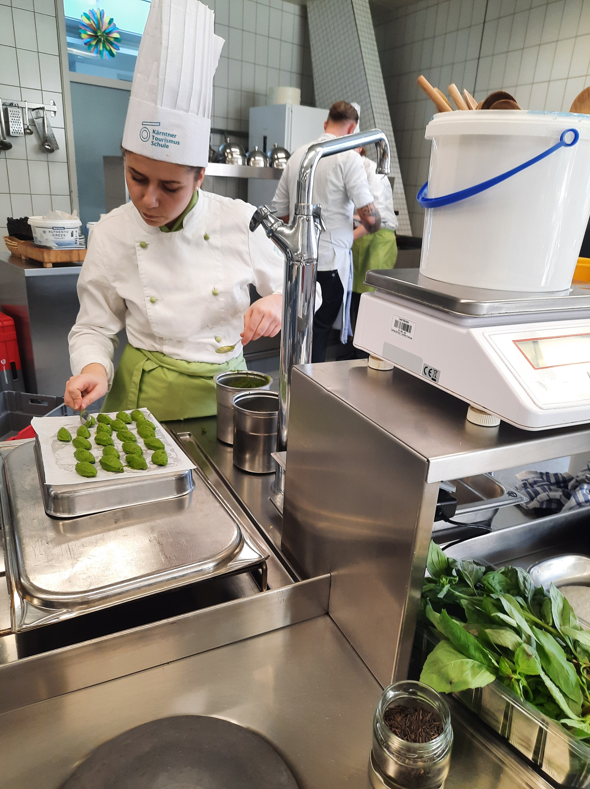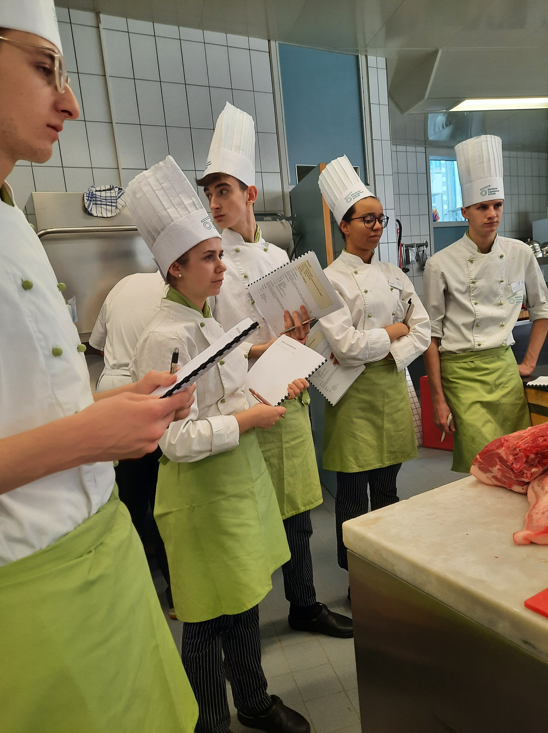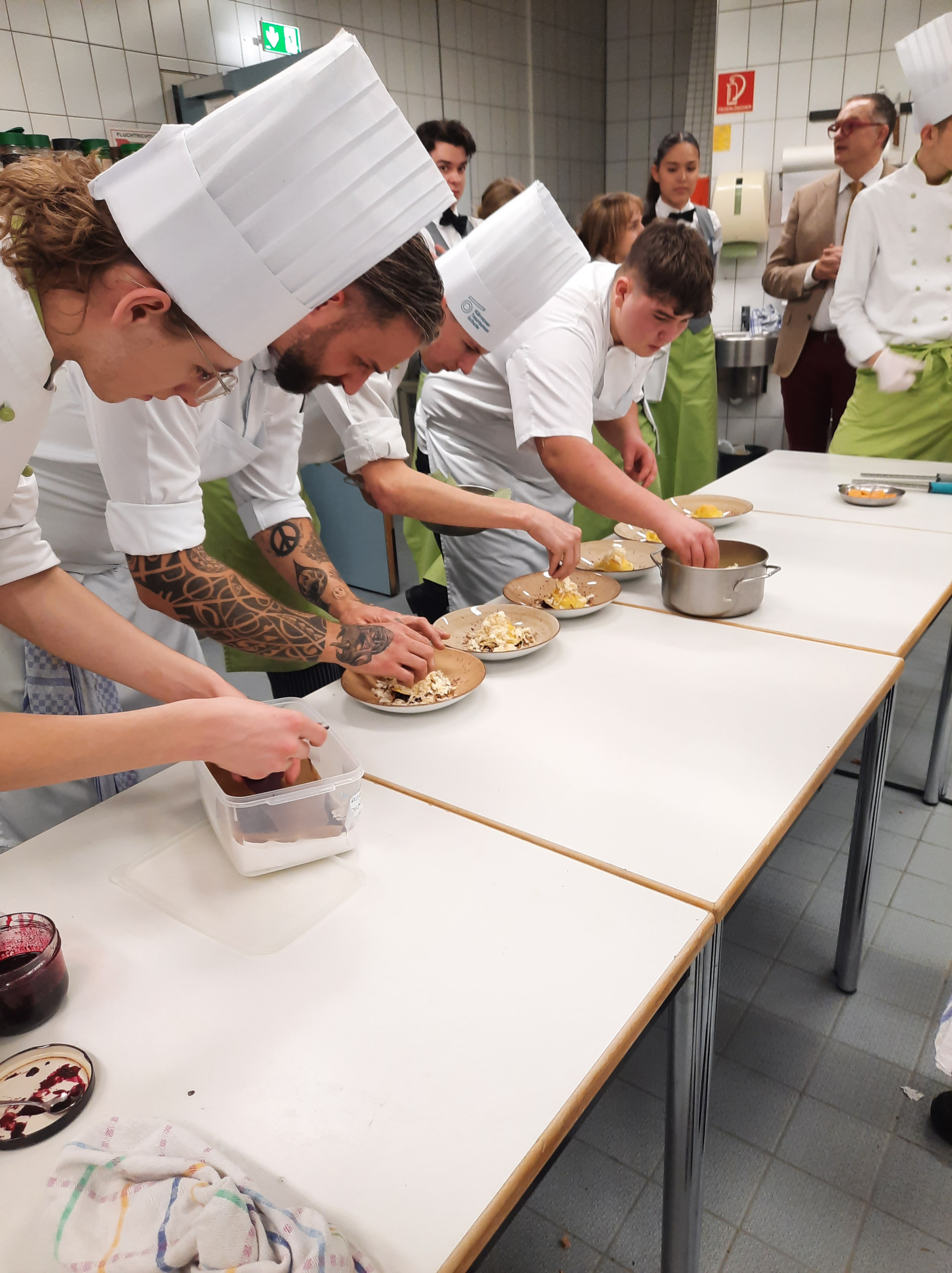 Die Schüler:innen konnten sich ein Bild über die anspruchsvollen Arbeitstechniken, aber auch die großartige Unternehmensphilosophie in dieser hohen Klasse der Küchenkunst machen. Der Jahreszeit entsprechend werden nur Produkte verwendet, gewachsen im Kreislauf der Natur – teils aus dem eigenen Garten, der eigenen Landwirtschaft oder von einheimischen Produzentinnen und Produzenten und ausgewählten Lieferanten.