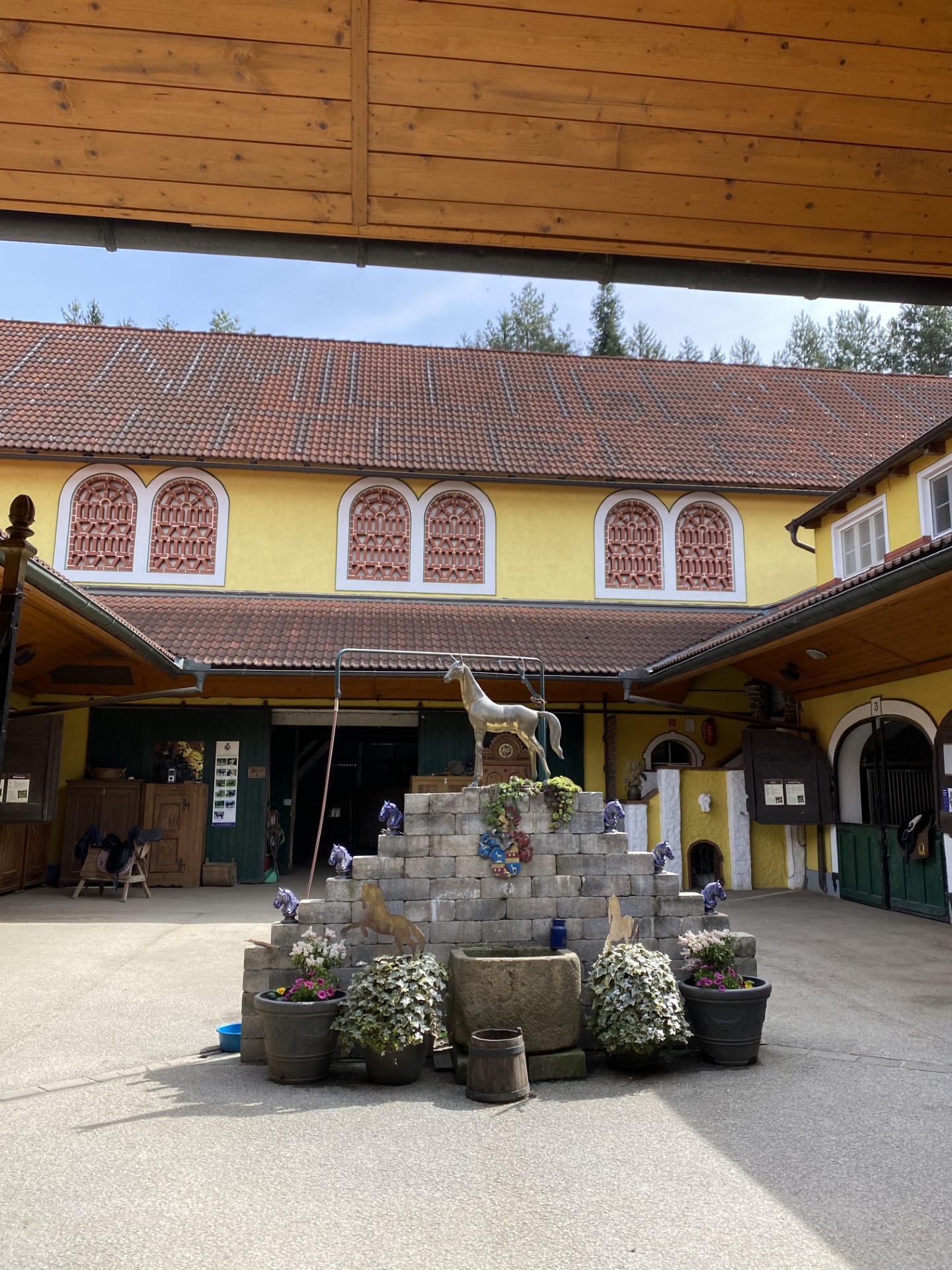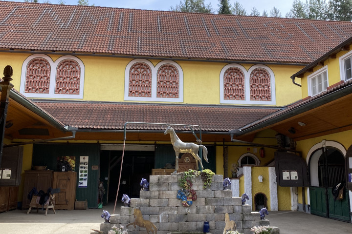 Unser erster Stop war der Töchterlehof. Dort angekommen nahmen wir in dem weltweit größten Holzpferd der Welt Platz. Dieses ist sogar im GuinessBuch der Rekorde eingetragen. Uns wurde Genaueres über den Hof, die Zucht, die Tiere und den Traditionen erzählt. Über die einzigartigen Heilkräfte der speziellen STUTENMILCH wurde uns in einem Video berichtet.