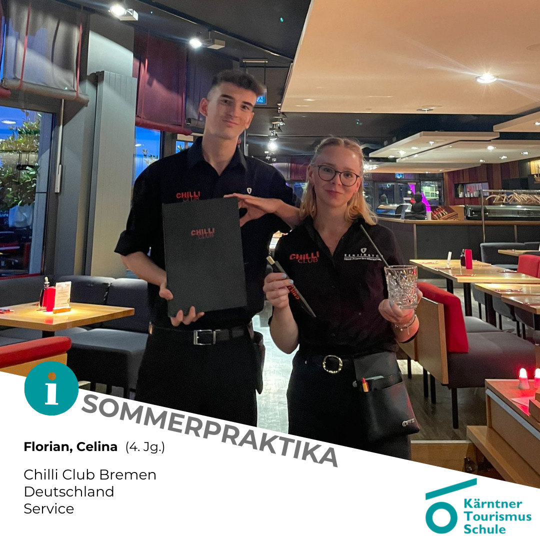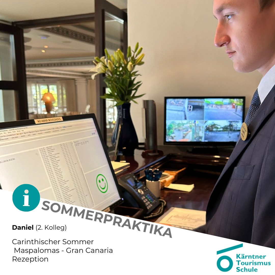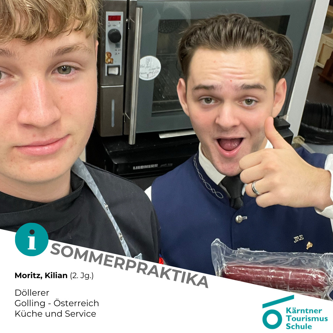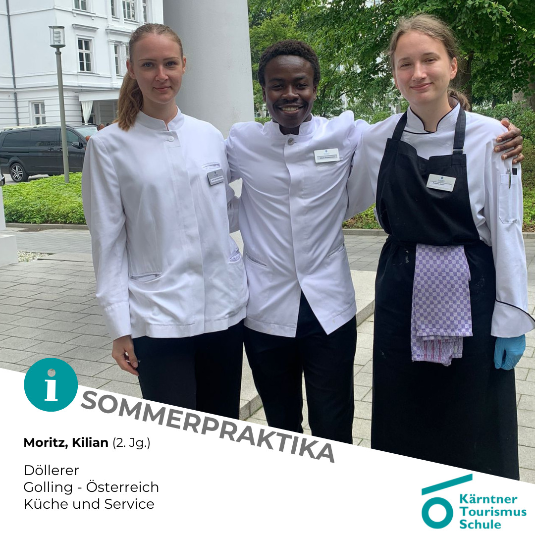 - Nicolas, Florian und Julian (3. Jg.) absolvieren ihr Praktikum im Parkhotel Pörtschach am Wörthersee. Nicolas (zum 2. Mal) im Service und Hotelmanagement (Direktion, Marketing und HR). Florian und Julian in der Hotelküche und im Beachclub.