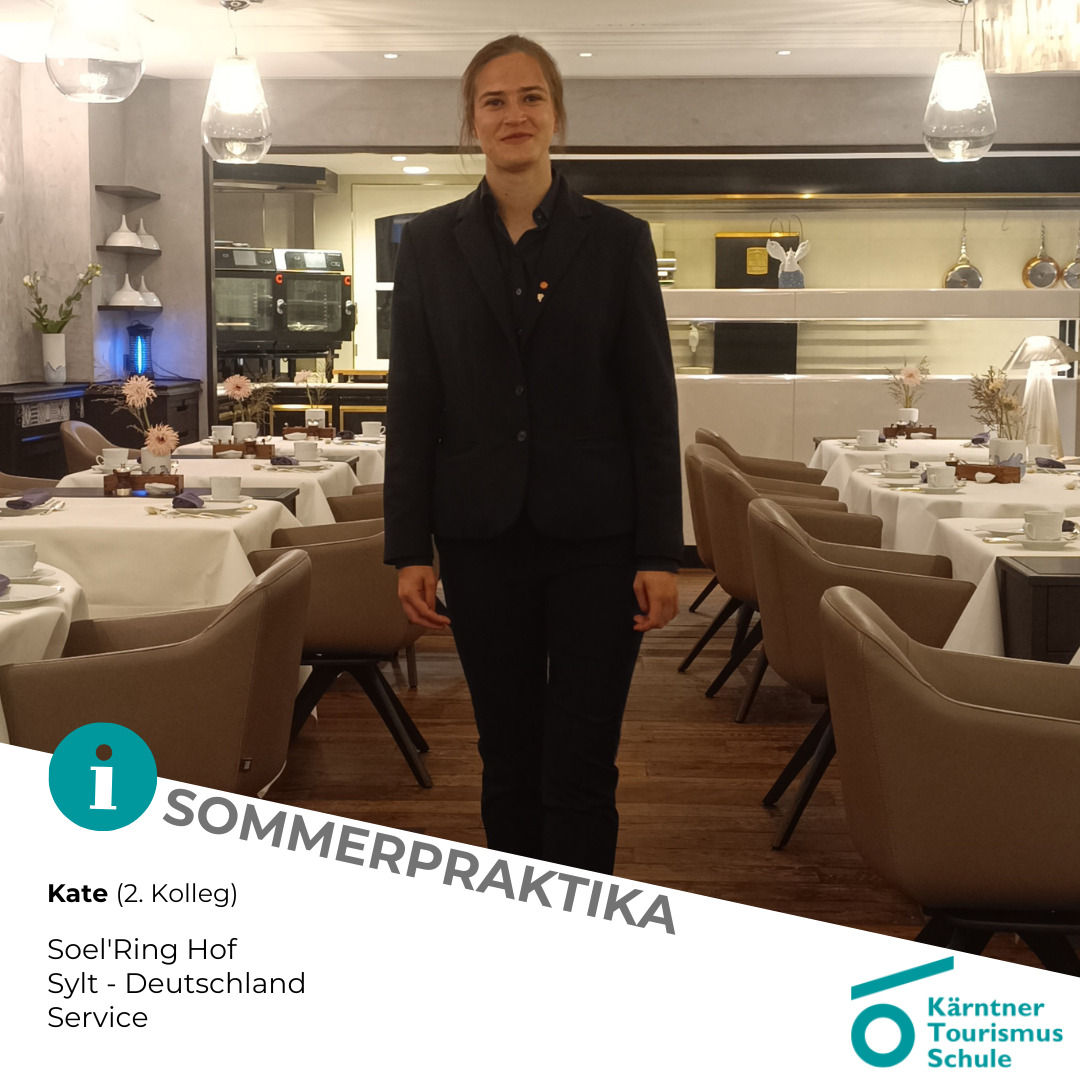 - Kate (2. Kolleg) hat es ebenso mit Erasmus+ in den Norden Deutschlands – nach Sylt zum Soel’Ring Hof verschlagen und sie unterstützt das Service-Team.