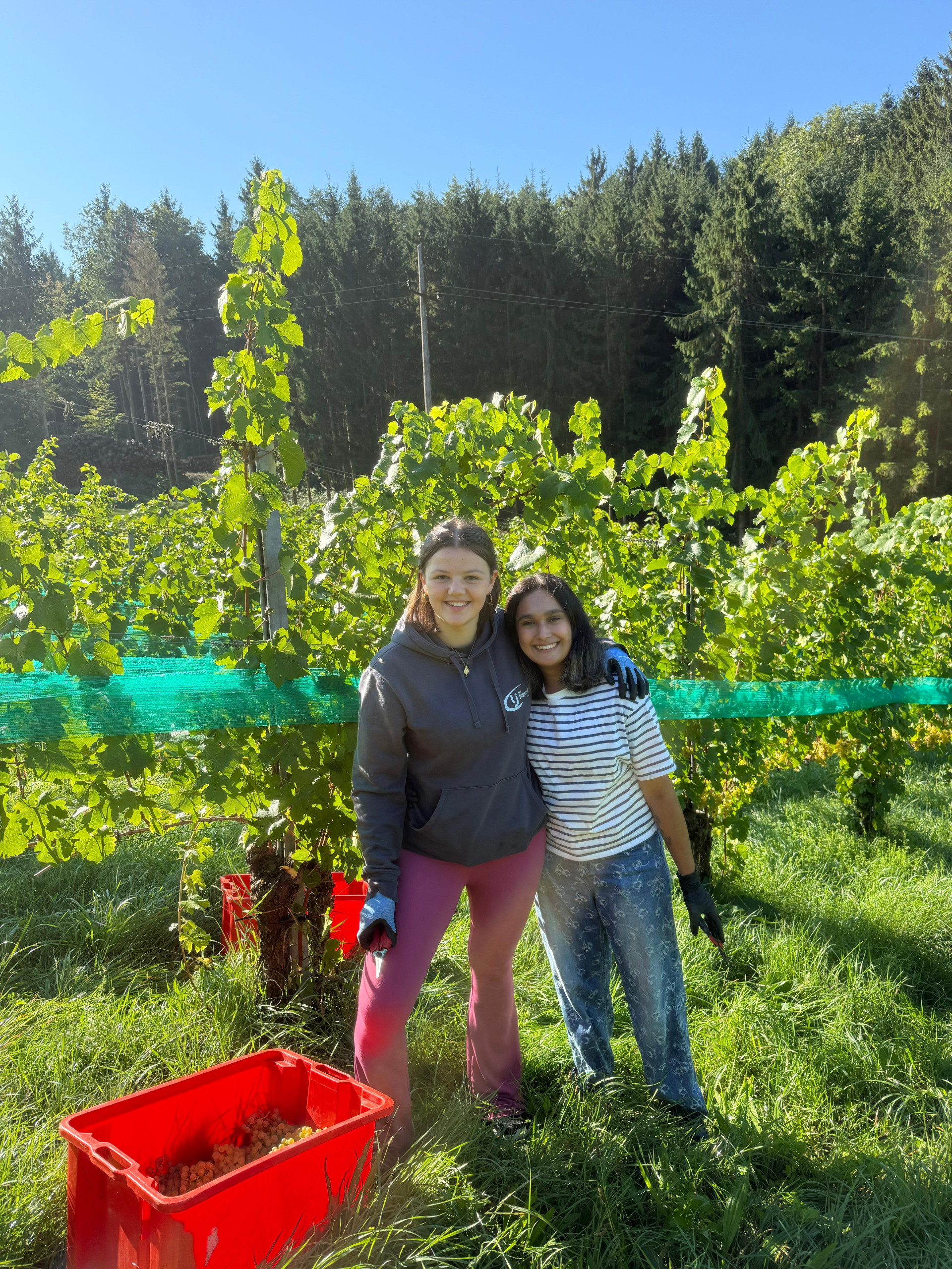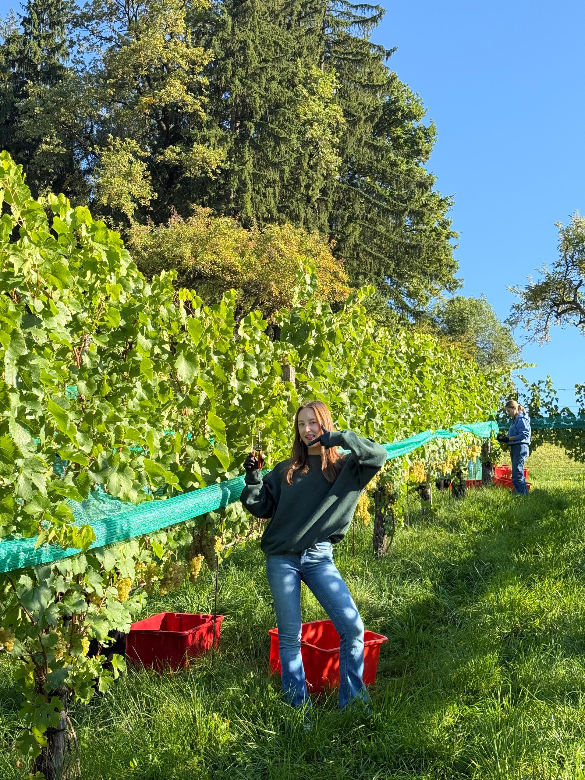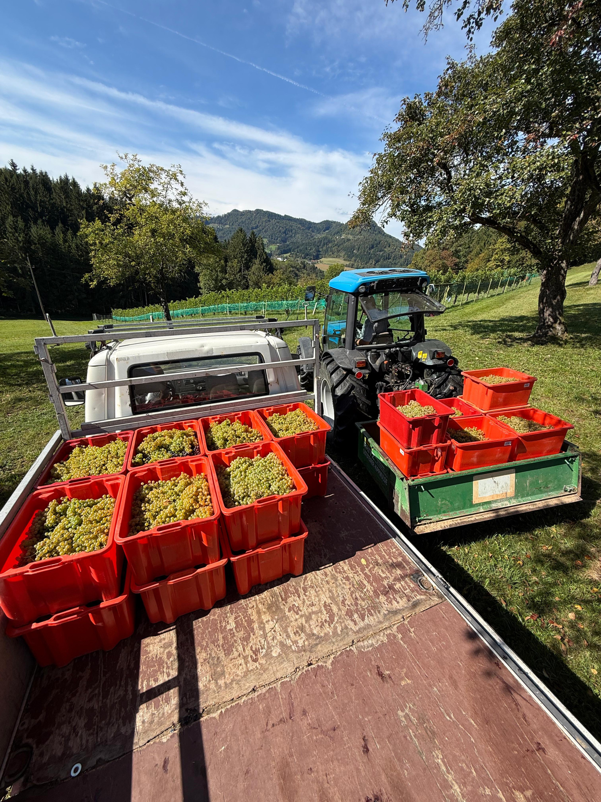 Gleich zu Schulbeginn hatte die 4. Jahrgänge die Gelegenheit, sowohl im schuleigenen Weingarten, direkt zwischen Schule und Internat, als auch im Rahmen einer spannenden Exkursion ins Lavanttal am Weingut Ritter in die Welt des Weinbaus einzutauchen. Nach einer herzlichen Einführung begann man mit der Ernte („Lese“) der grünen Chardonnay-Trauben. Insgesamt konnten die Schüler:innen 1,9 Tonnen dieser Trauben lesen, in Kisten sammeln und auf den Traktor transportieren. Nach einer kurzen Stärkung setzten die Schüler:innen die Arbeit mit den blauen Trauben für den Rotwein fort. Es wurde in Zweiergruppen gearbeitet, um das Lesen und den Austausch untereinander zu erleichtern.