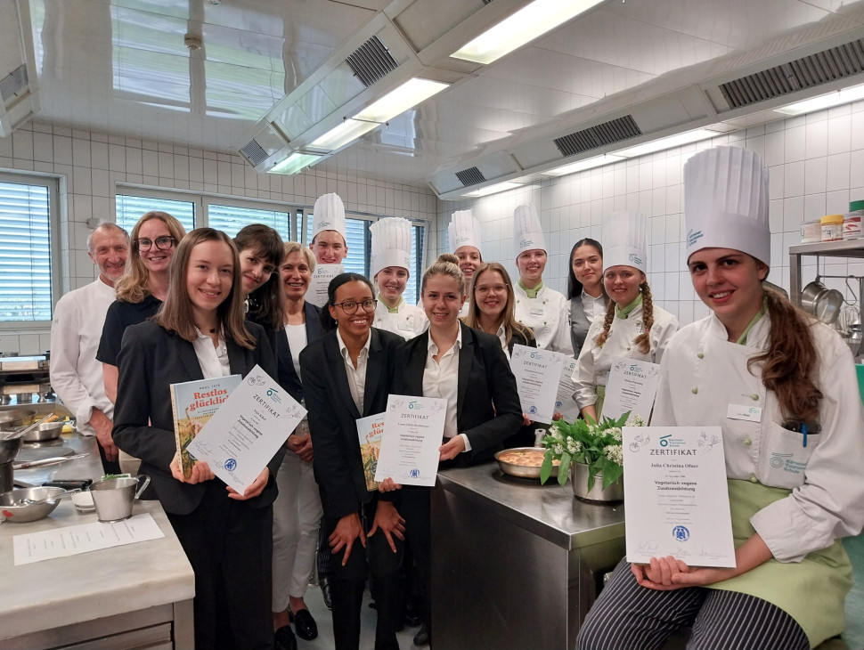 14 Schüler:innen erhielten ihre Zertifikate für das Freifach „Veggie-Masterclass“ überreicht. Die „Veggie-Ausbildung“ an der Kärntner Tourismusschule ist am Puls der Zeit und trifft auch die zunehmende Vorliebe der Schüler:innen für vegetarische und auch vegane Ernährung.