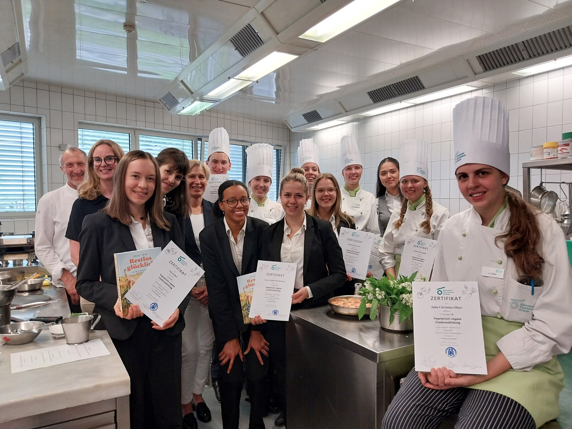 Ein besonderes Highlight bei der Zertifikatsverleihung waren fleischfreie Gerichte wie Vollkornburger, Spinatknödel, Schmelztomaten, Kimchi-Palatschinken oder pikante Buchteln mit rotem Pesto sowie vegane Waffeln mit Kokoseis. Wir gratulieren herzlich zu dieser spannenden Zusatzqualifikation!